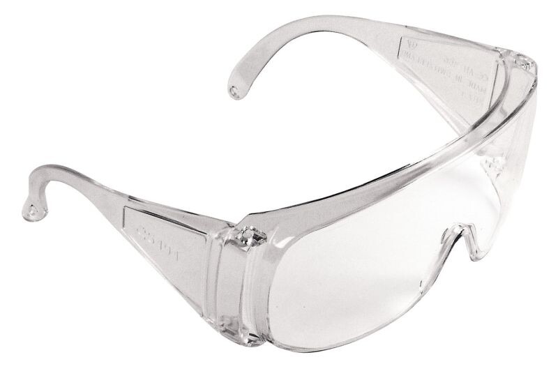 Ochranné brýle s čirým polykarbonátovým zorníkem tř. 1F panoramatického tvaru a možností nasazení na dioptrické brýle.