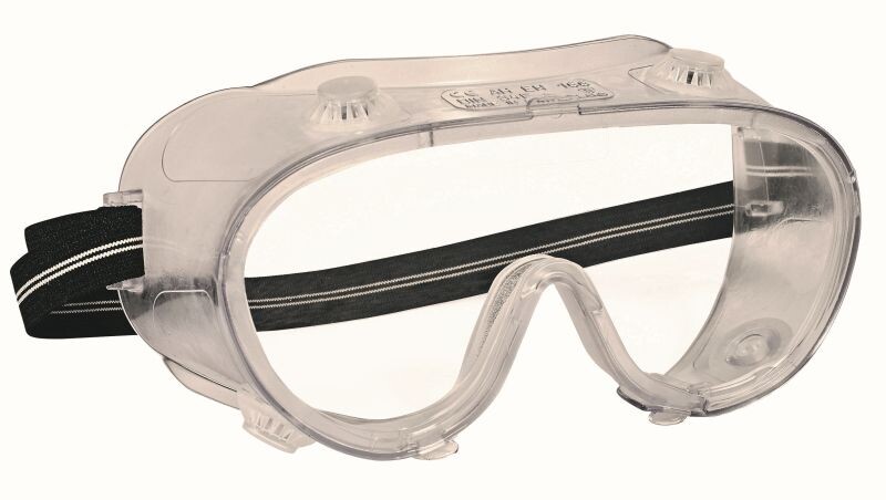 Ochranné nepřímo větrané brýle s plochým PC zorníkem tř. 1F, měkkou plastovou lícnicí a ochranou před stříkajícími kapalinami.