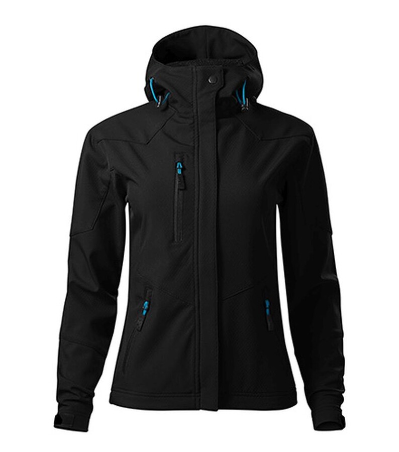 Dámská softshellová bunda, 100 % polyester 75D s povrchovou úpravou NANO, prodyšná membrána, 100 % polyester - perforovaný micro fleece s kontrastními detaily, efektní textura softshellu, úprava NANO zabraňuje průniku vody, dvě přední kapsy a jedna náprsní kapsa na zip, kapuce na stažení šňůrkou, kapuce a spodní lemy rukávů nastavitelné suchým zipem, projmutý střih