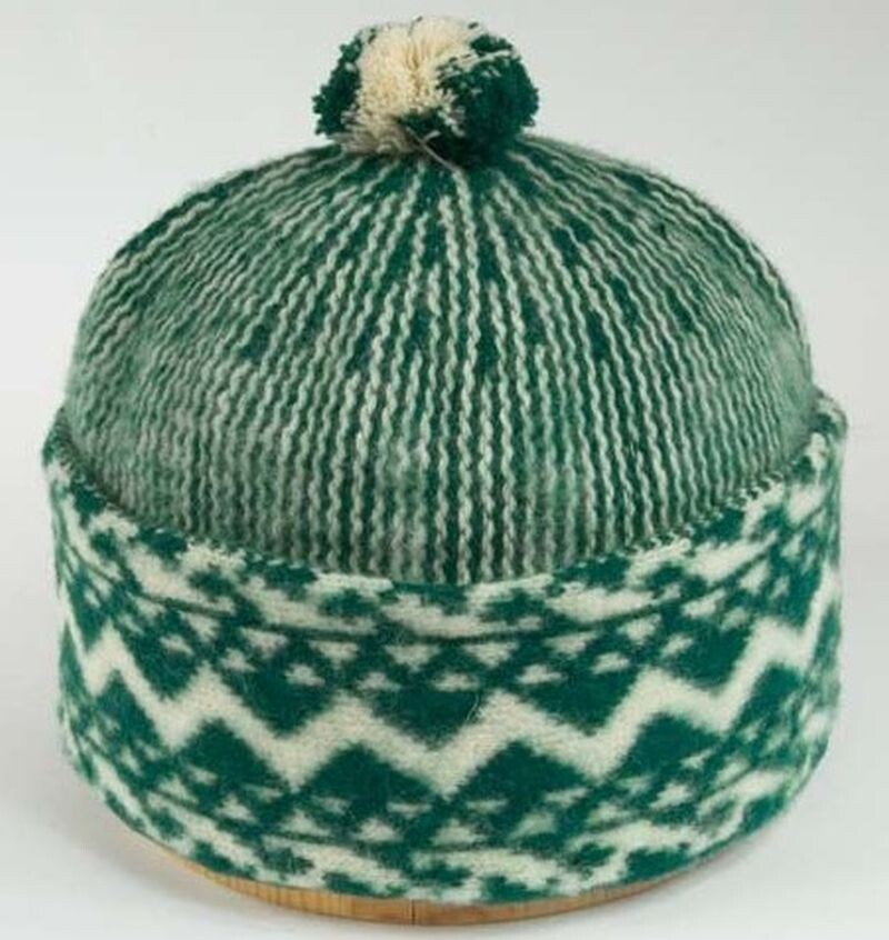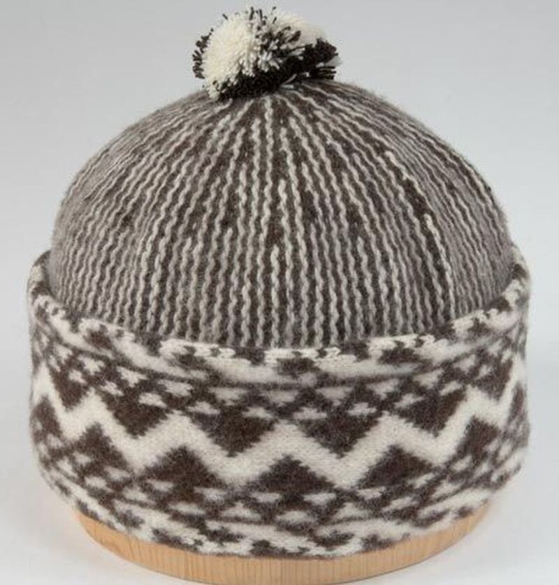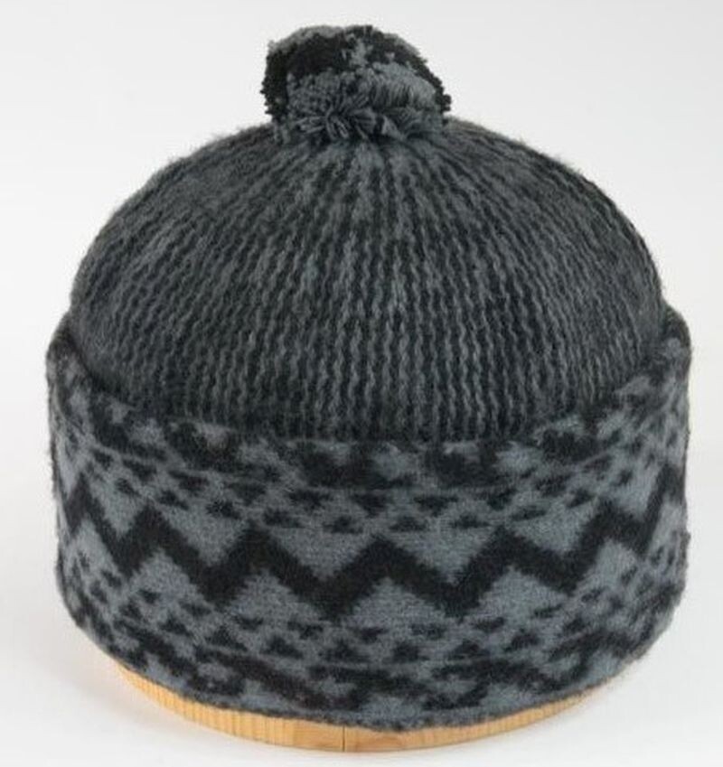 Tradiční pánská čepice "zmijovka" se vzorovaným ohrnutý lemem a bambulkou.