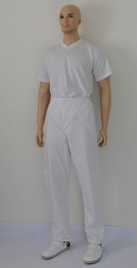 Pánské bílé kalhoty, zapínání na knoflíky, 2 přední kapsy, 1 zadní kapsa. Vhodné do zdravotnictví, gastronomie a potravinářství.
