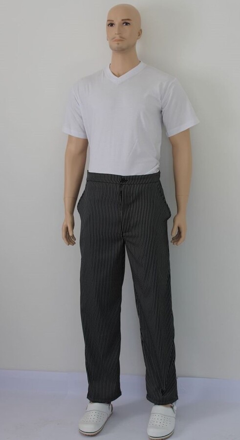Kalhoty z proužkované látky. Vpředu 2 kapsy, zapínání na knoflíky. V pase na pevný pásek s možností úpravy. Vhodné do gastronomie.