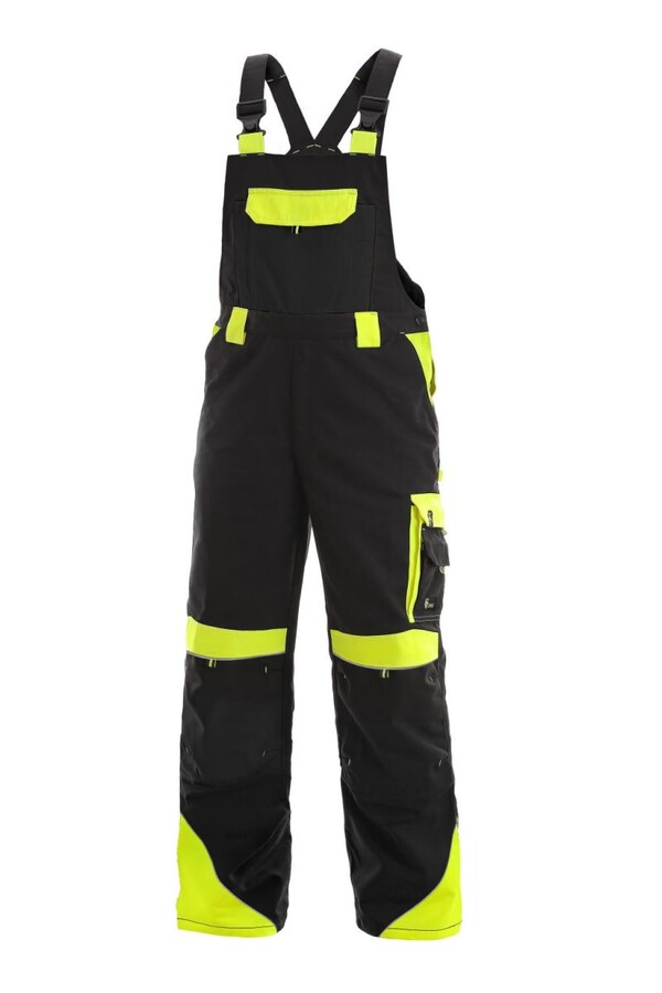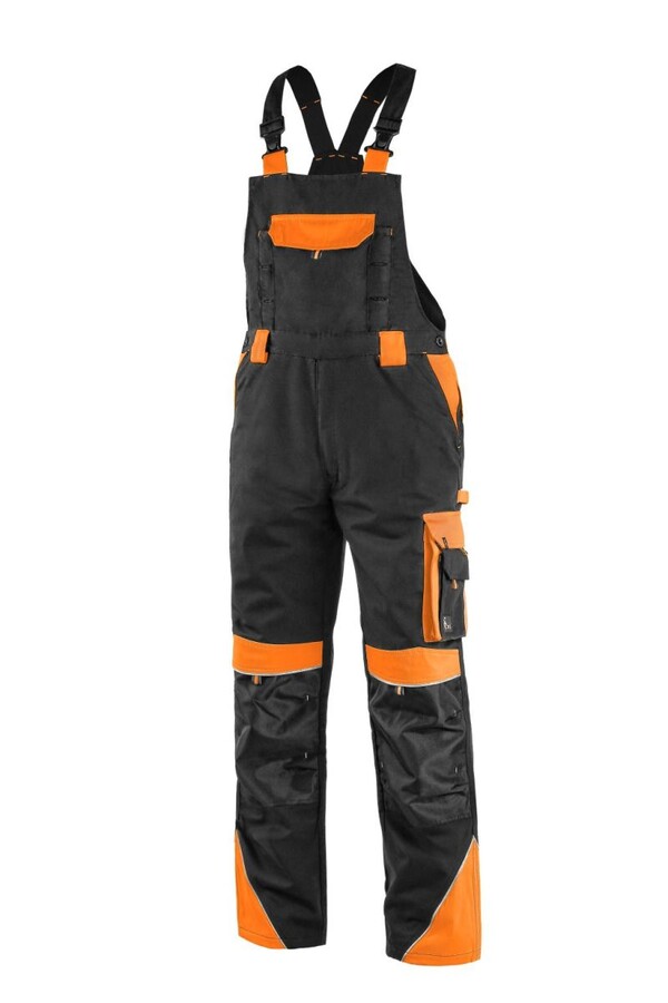 Pánské zahradníky, zesílená kolena s možností vložení kolenních výztuh, pevný pas s poutky na opasek, přední klínové kapsy, zadní kapsy s klopami, boční multifunkční kapsy, náprsenka s kapsou, reflexní doplňky.