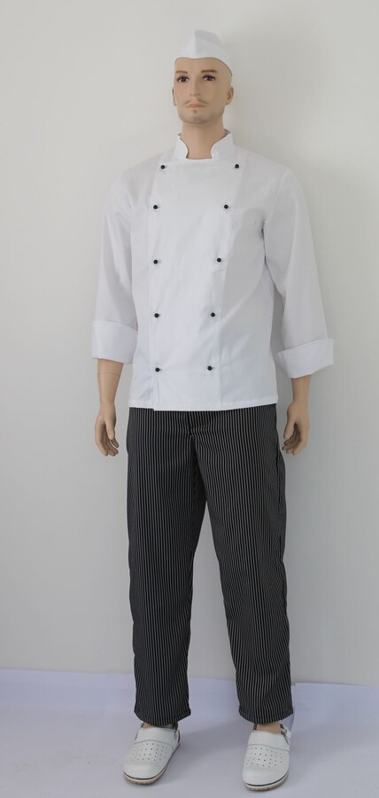 Kuchařský rondon dvouřadý, stojáček, na rukávech manžety na ohrnutí, provlékací rondonové knoflíky černé (2 řady po 5 kusech)