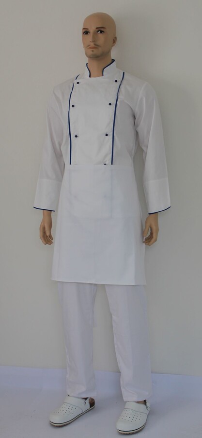 Pasová kuchařská zástěra, vázačky z bílého tkalounu. Rozměry: délka 55 cm, šířka 70 cm.