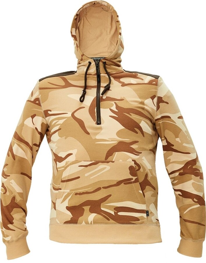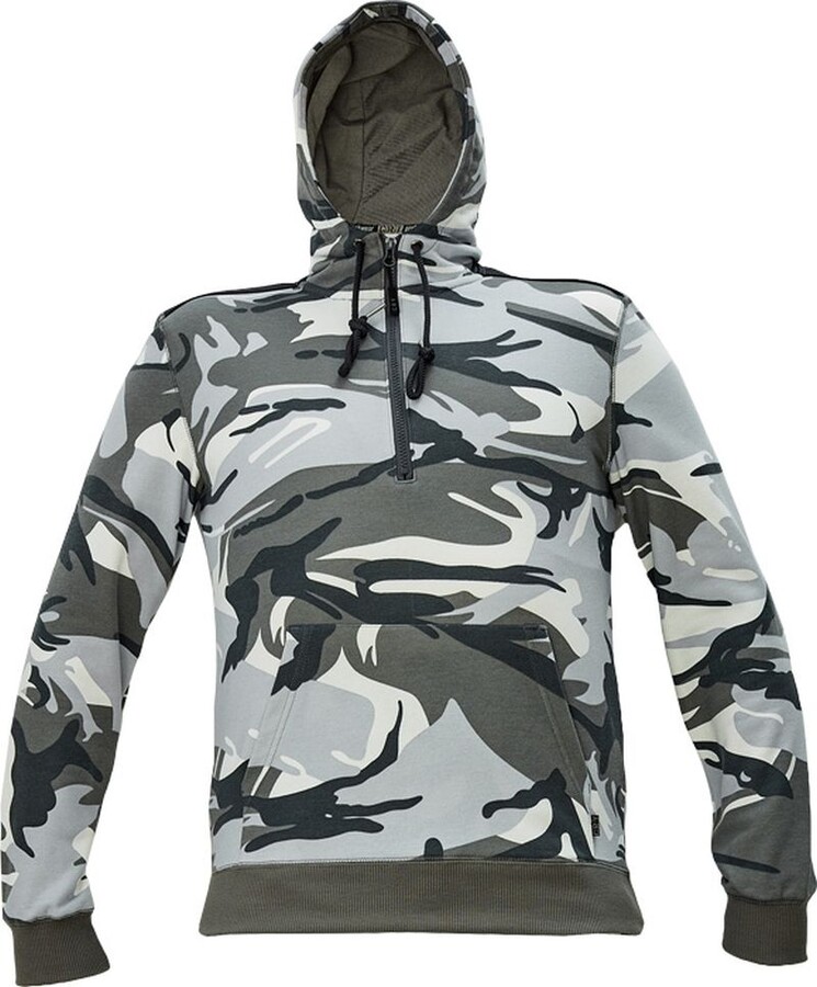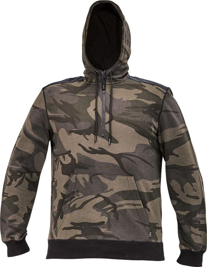 Pánská polopropínací mikina s kapucí a klokaní kapsou • zesílené část v oblasti ramen • elastické náplety na rukávech a spodním obvodu • potištěný nepočesaný výplněk s potiskem crambe- maskáčový vzor.