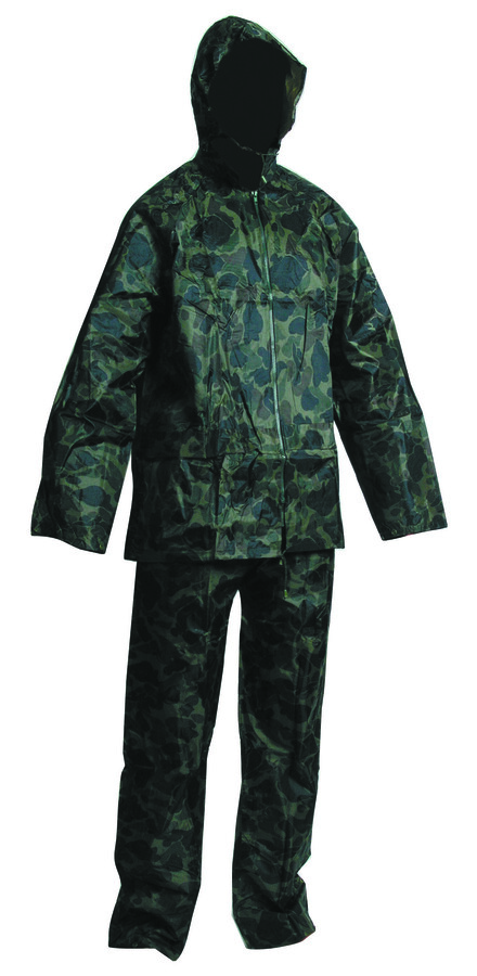 Voděodolný oblek s kapucí - dvoudílný • plášť s integrovanou kapucí v límci a kalhoty v pase do gumy • dvě přední široké kapsy kryté légami proti průniku vody • spodní část rukávů lze regulovat drukem • ventilace na zádech a v podpaží • transportní obal