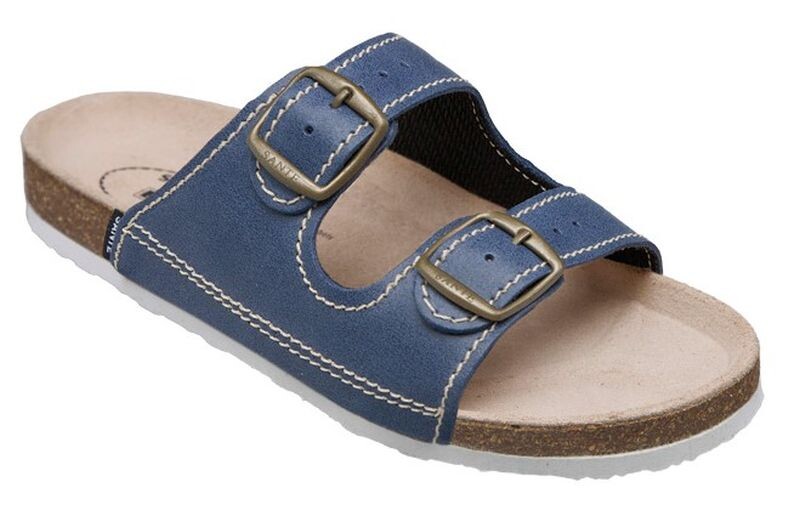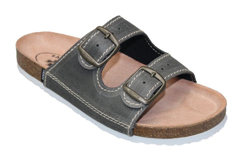 Zdravotní korkové kožené pantofle Santé se dvěma pásky na přezku. Pantofle mají koženou tvarovanou stélku.