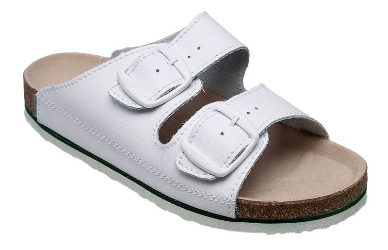 Dámský bílý pantofel z mikrovlákna s koženou stélkou na klínku, nastavitelná šířka na dvě přezky. Protiskluzová podešev, nezanechává šmouhy na povrchu. Certifikovaná pracovní obuv.