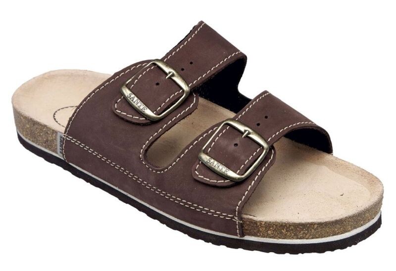 Pánský hnědý pantofel, pohodlná zdravotní obuv s anatomicky tvarovanou koženou stélkou, zabraňuje tvorbě ploché nohy. Jsou určeny jako zdravotní, pracovní, domácí či vycházková letní obuv. Podešev protiskluzová. Nastavitelná šíře obuvi - na dvě přezky. Certifikovaná obuv.
