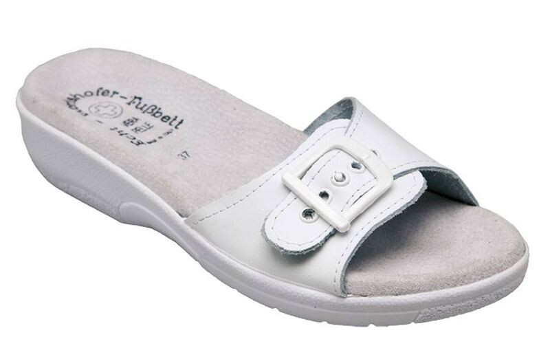Dámské profi pantofle, vhodné do zdravotnických provozů, domovů a pečovatelských domů i škol, jednopásková se sponami, obuv je vyrobena z přírodních materiálů (useň, textil), jsou měkké, prodyšné a absorbují vlhkost, jejich důležitou vlastností je rovněž to, že se přizpůsobí anatomickému tvaru nohy