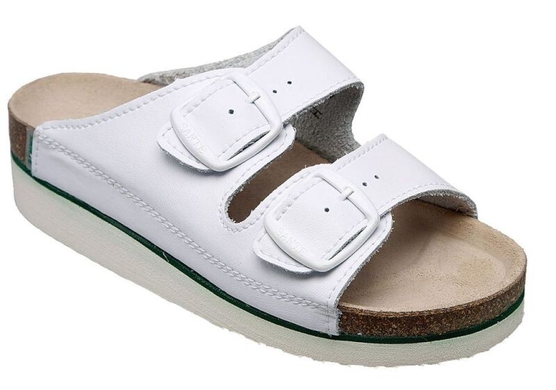 Dámský bílý pantofel z mikrovlákna s koženou stélkou na klínku, nastavitelná šířka na dvě přezky. Protiskluzová podešev, nezanechává šmouhy na povrchu. Certifikovaná pracovní obuv.
