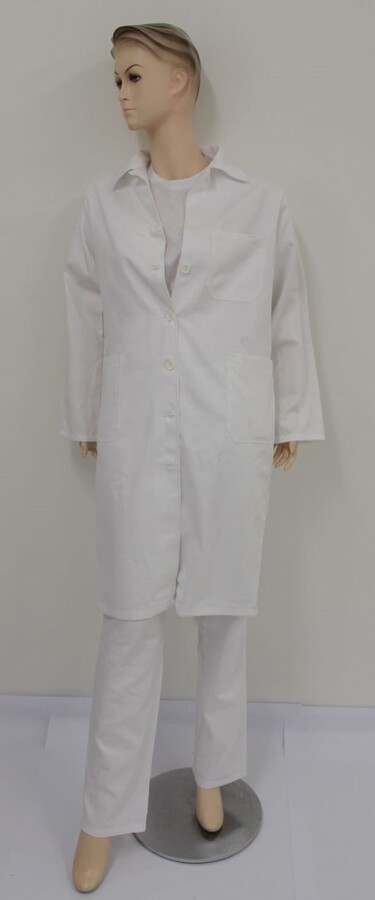 Dámský bílý plášť, 2 spodní a 1 náprsní kapsa, vzadu dragoun, délka ke kolenům.