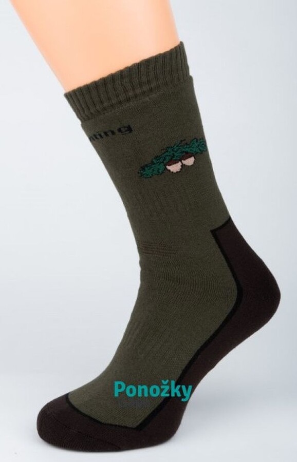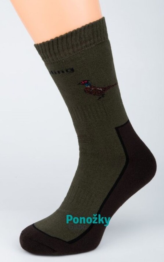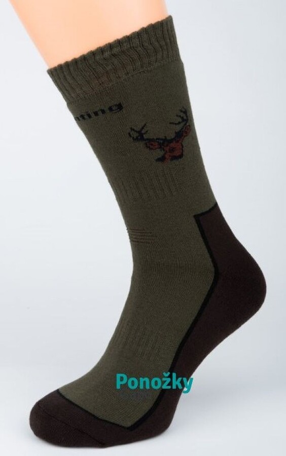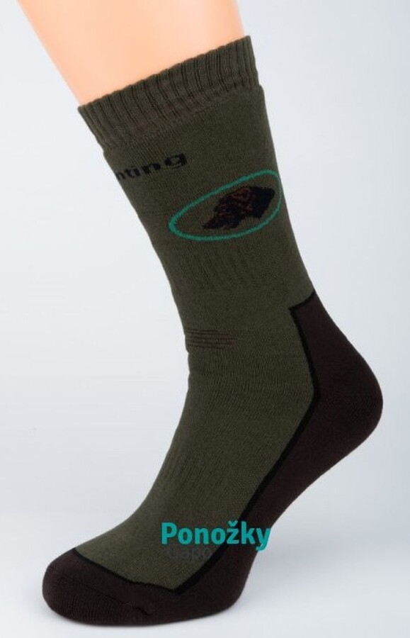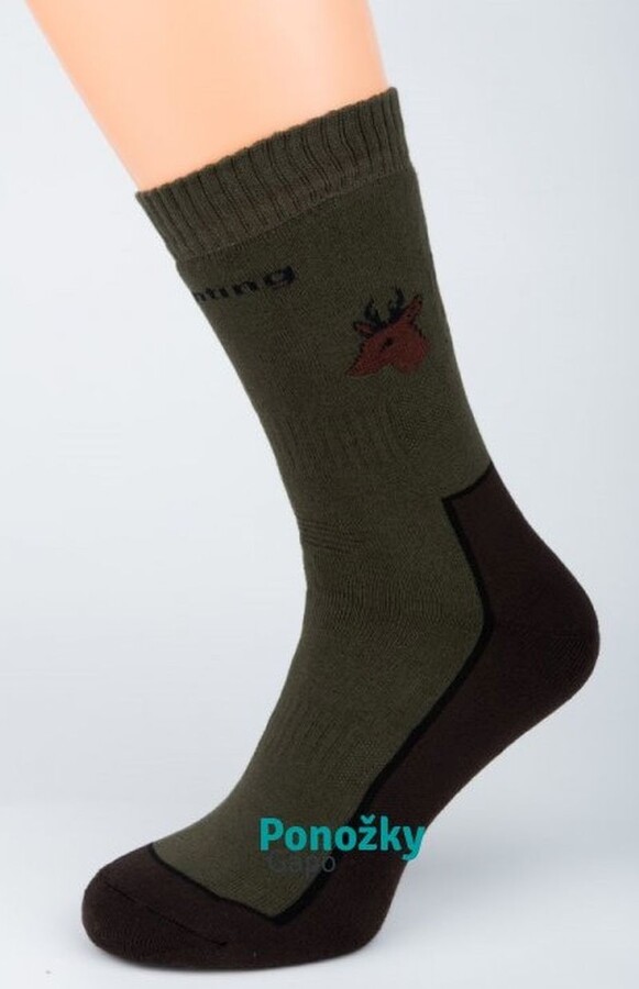 Pánské zimní myslivecké ponožky, celofroté s mysliveckými motivy. Thermo ponožka, středová část chodidla je vybavena elastickým pruhem pro zabránění otáčení ponožky po chodidle. Extrémní pružnost dosažena přidáním elastickým vláknem, výborná přilnavost, zesílené části namáhaných míst. Myslivecká ponožka je vybavena kanálkem pro odvod potu. Vhodné pro celodenním nošení.