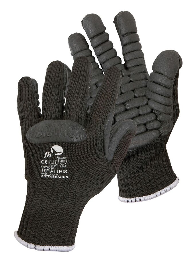 Certifikované antivibrační rukavice, úplet ze směsi bavlny a polyesteru, nitrilové antivibrační polštářky na dlani. EN 10819