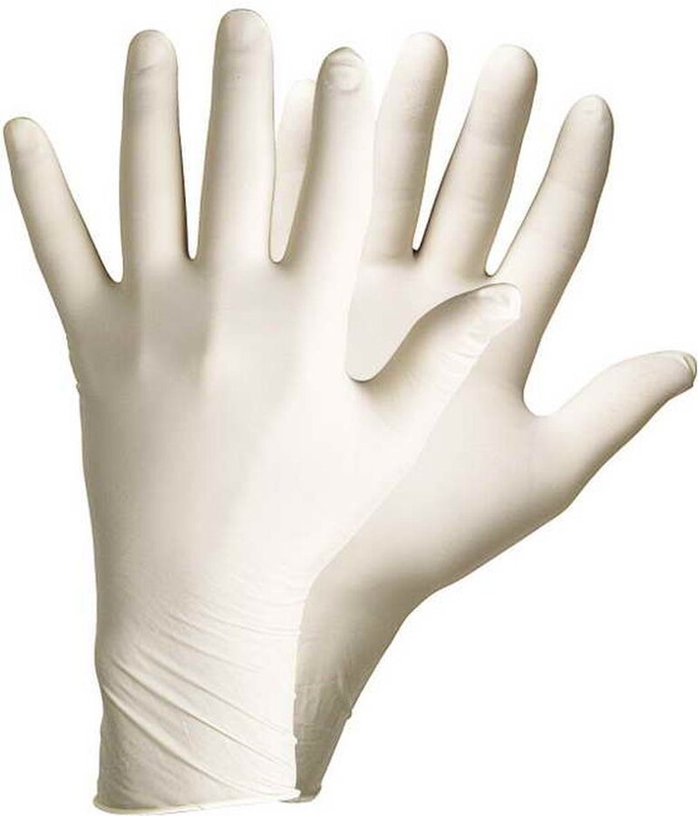 Jednorázové latexové pudrované rukavice vhodné pro krátkodobý styk s potravinami.