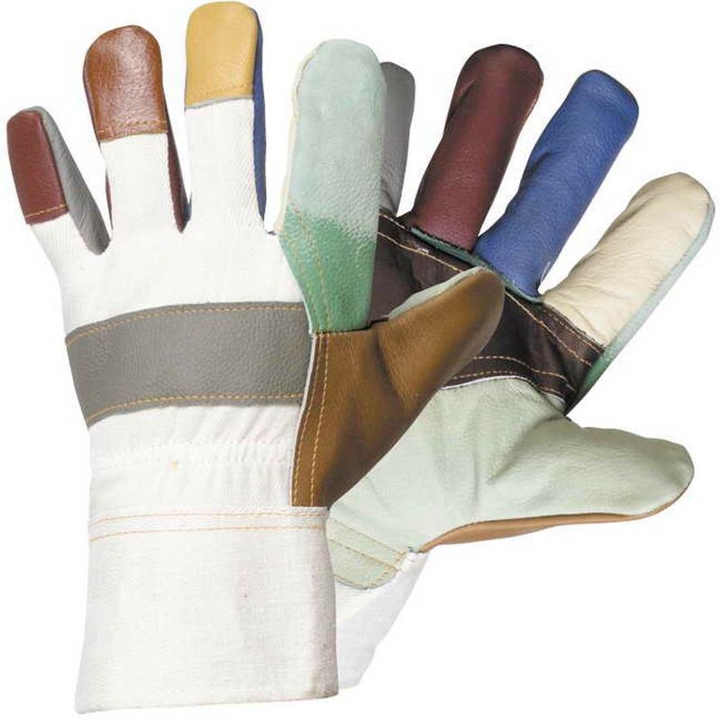 Rukavice z různobarevné lícové nábytkové hověziny v dlani s teplou podšívkou a bavlněnou tkaninou na hřbetu a manžetě.