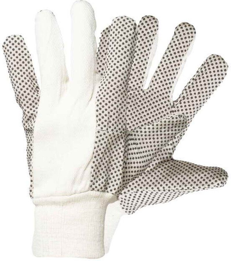 Rukavice šité z bavlněného plátna, s PVC terčíky v dlani a na prstech a pružným nápletem.