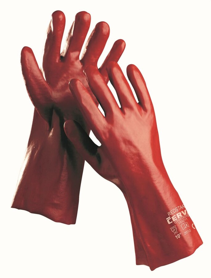 Rukavice šité z bavlněného úpletu, máčené v PVC, v celkových délkách 27 cm.