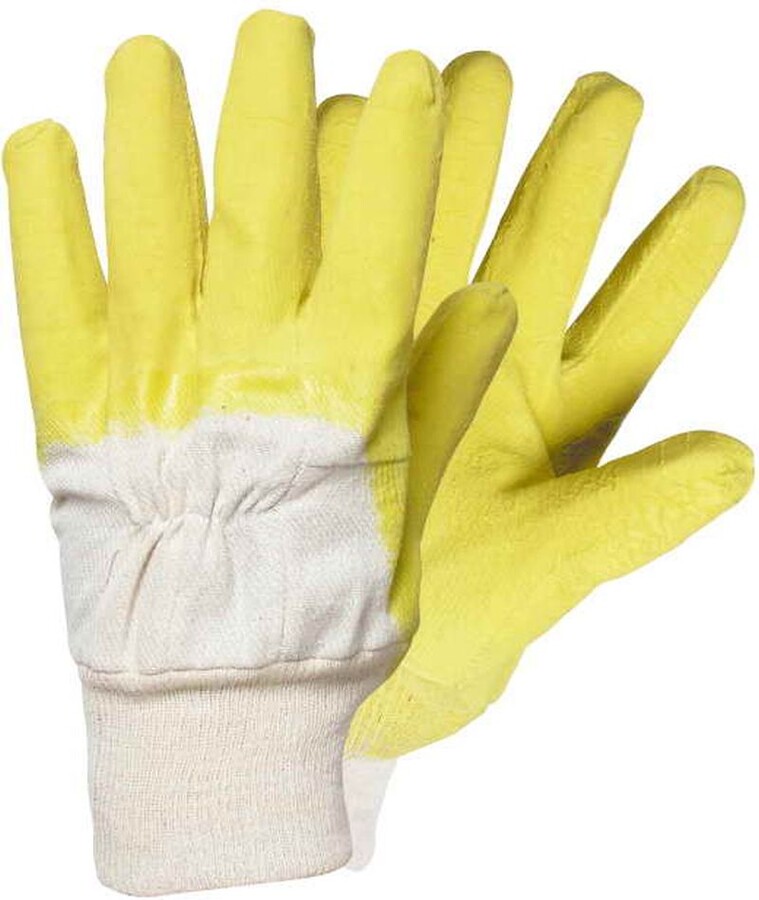 Rukavice šité z bavlny, polomáčené v přírodním latexu, s protiskluzovou úpravou v dlani a na prstech.