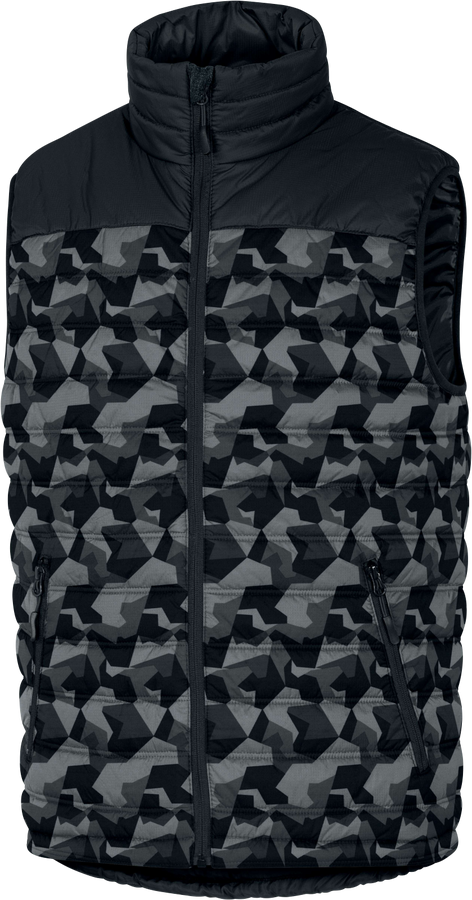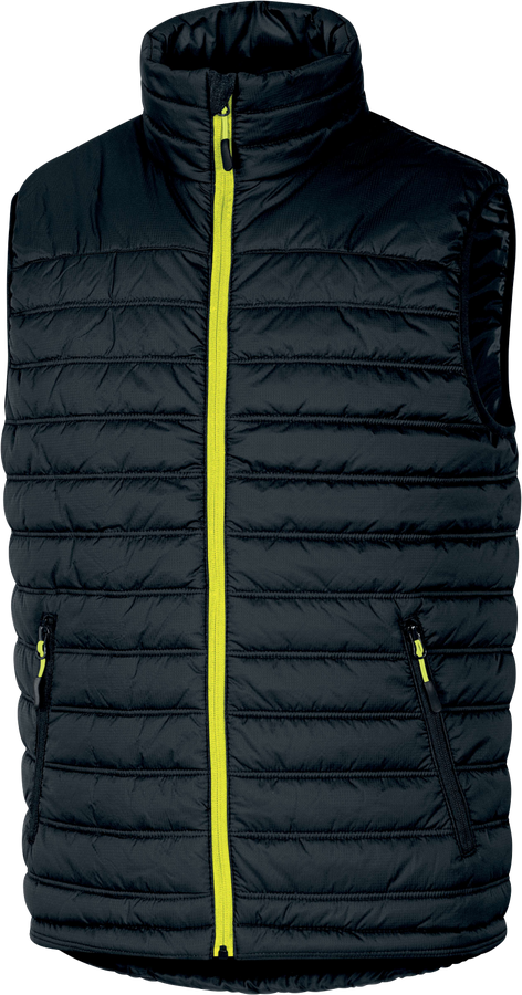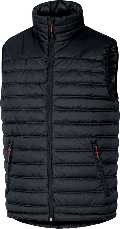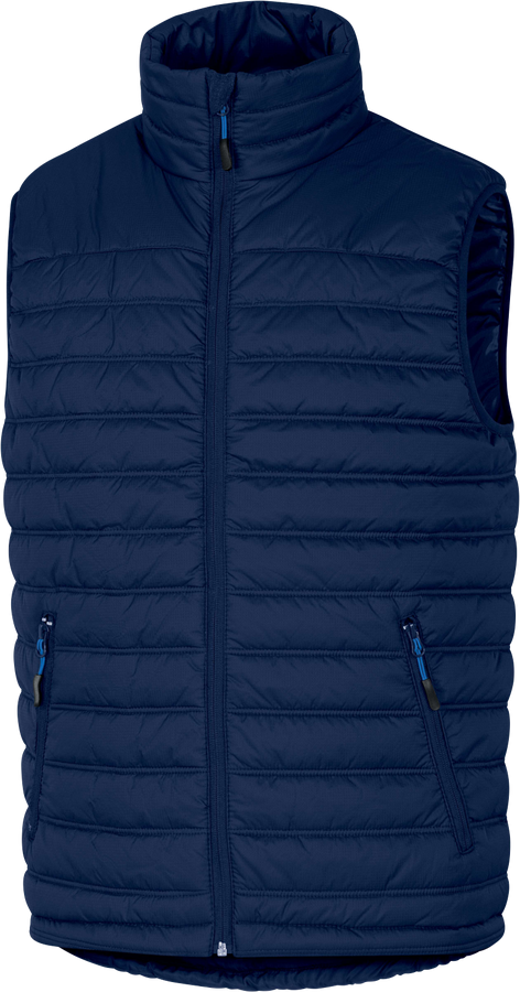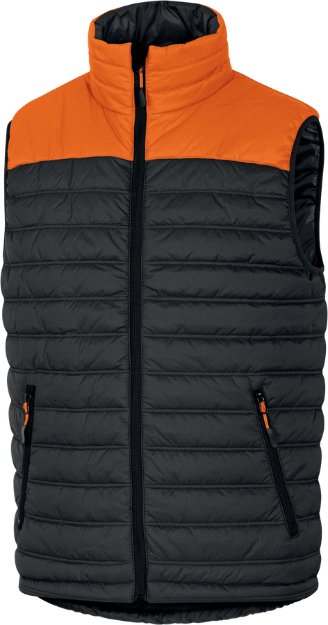Vesta. Zapínání na zip krytý lištou. Průramky se zakončením šikmou lemovkou. Zesílená záda. 3 kapsy.
